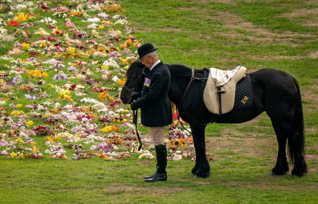 Then finally, and one of the most emotional moments of the whole day, was seeing the Queens horse Emma, standing alone with her trainer, on the drive way in to Windsor Castle. The Queens headscarf draped over her saddle. Such a touching tribute, along with two of her Corgis waiting outside the gate. I always feel so sad for animals when they lose their owner 😦