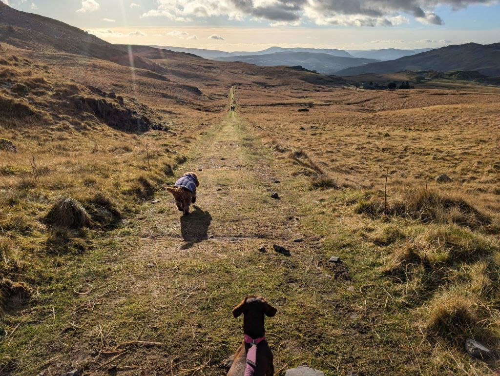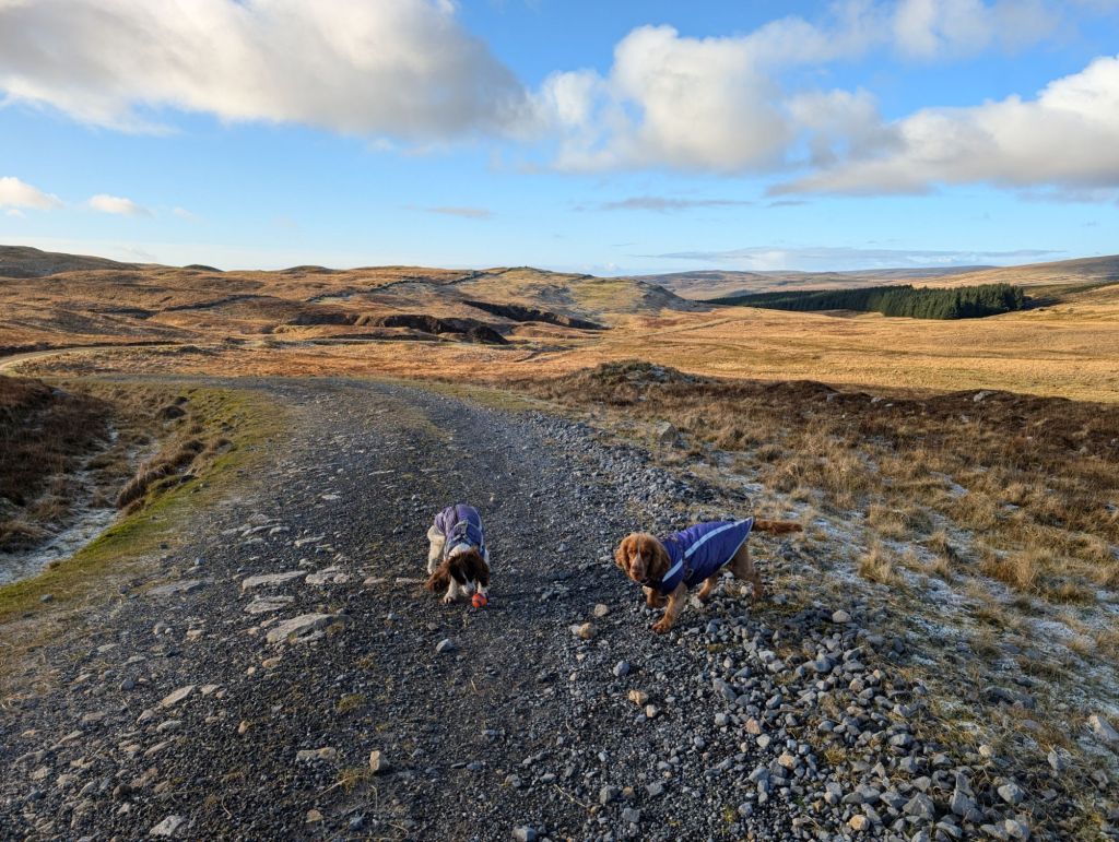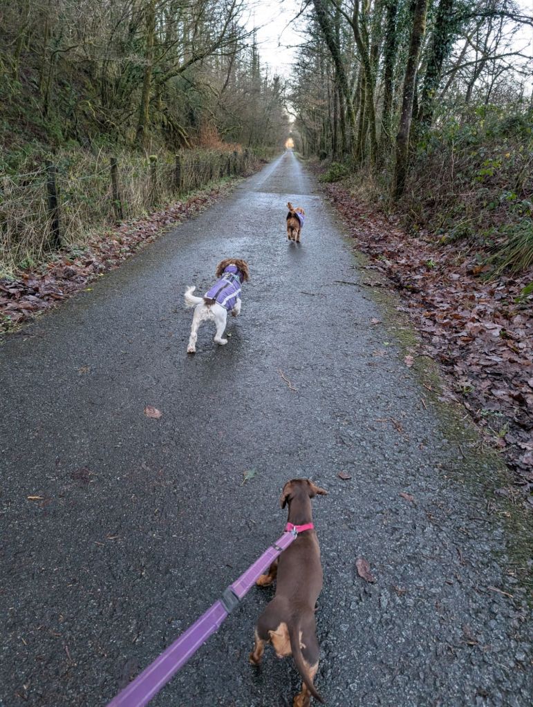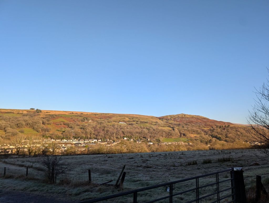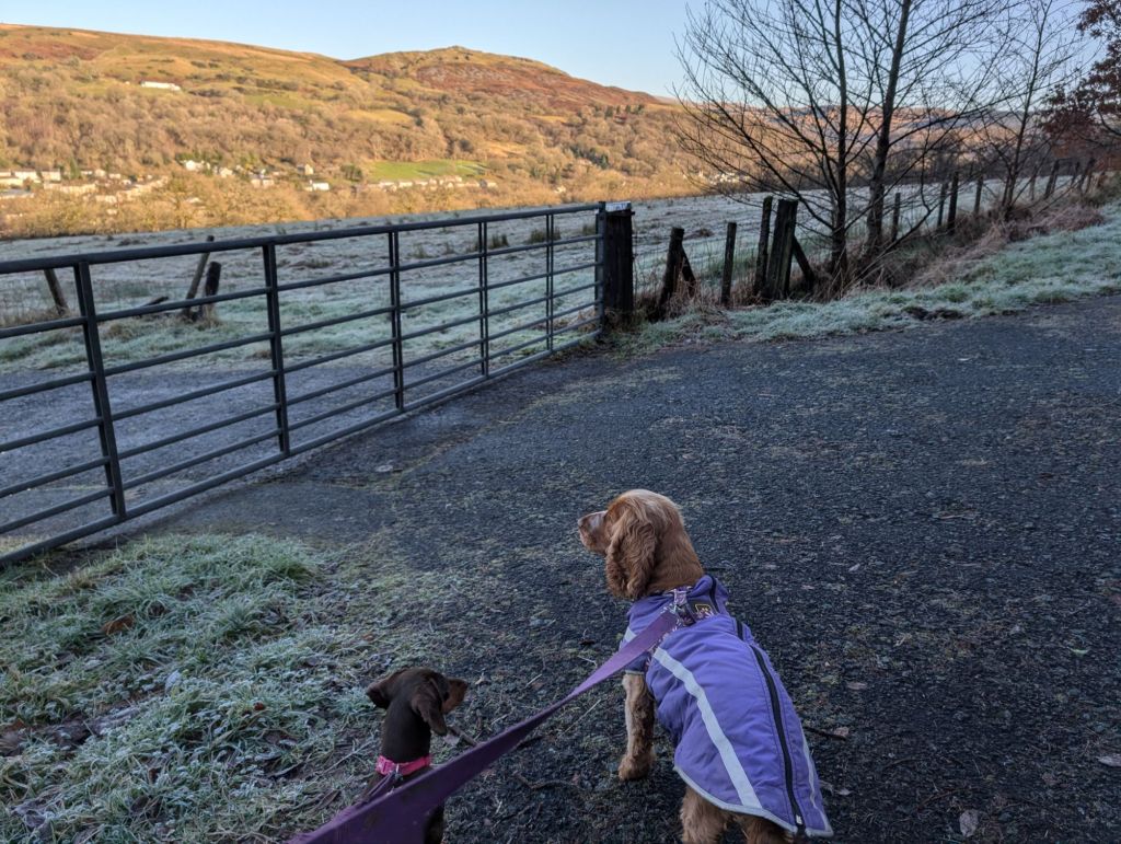 Day 2: Thursday January 2nd. The day started with an earlyish morning walk with the dogs, Honey, Motsi and Delilah. We walked for 45 minutes along the cycle track up Cae Hopkin. The temperature was zero degrees, frost on the ground, and the path slippery.