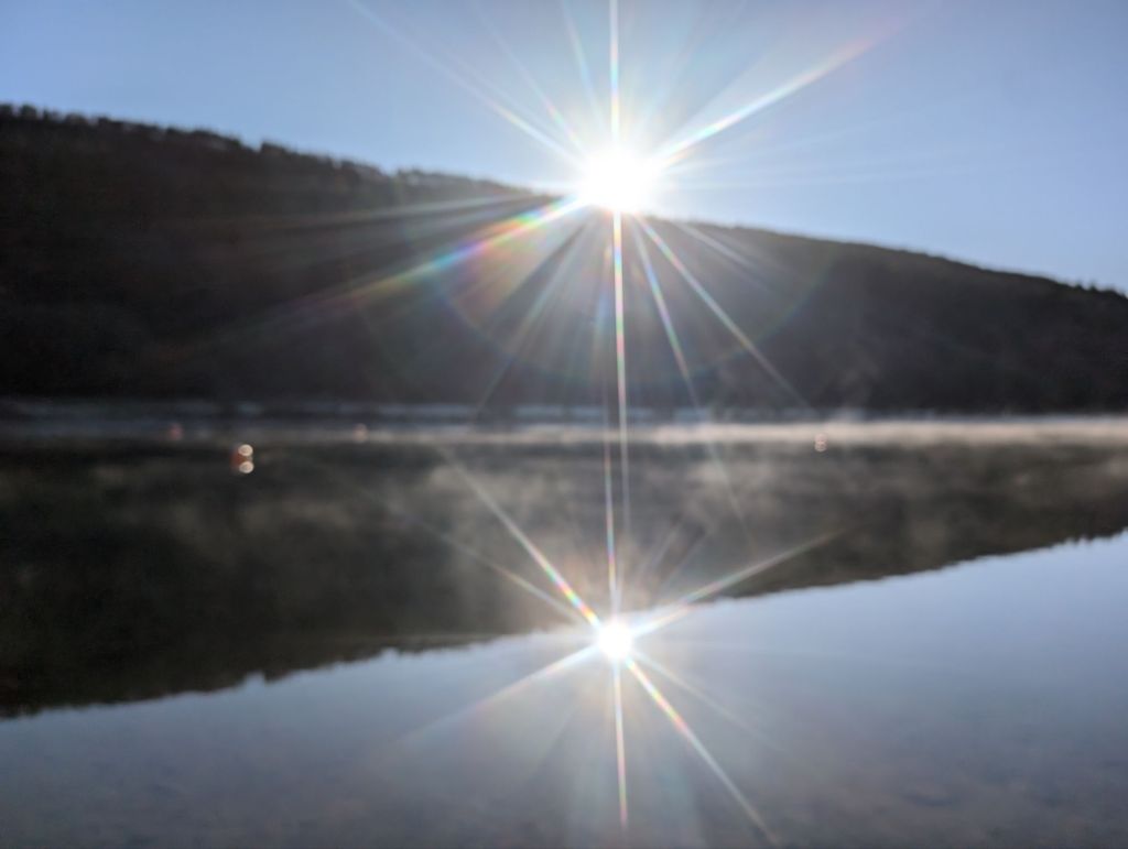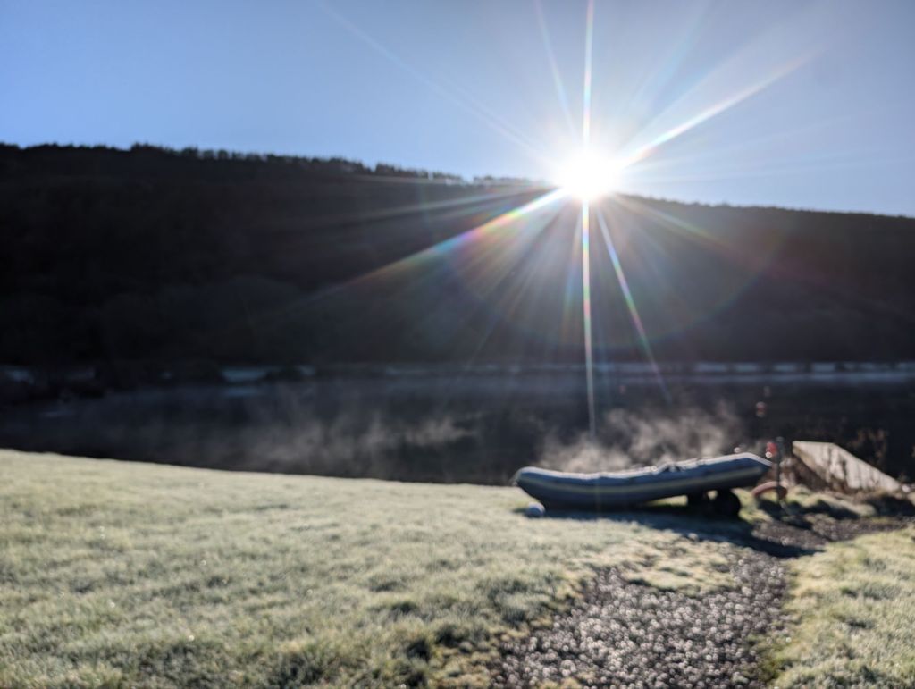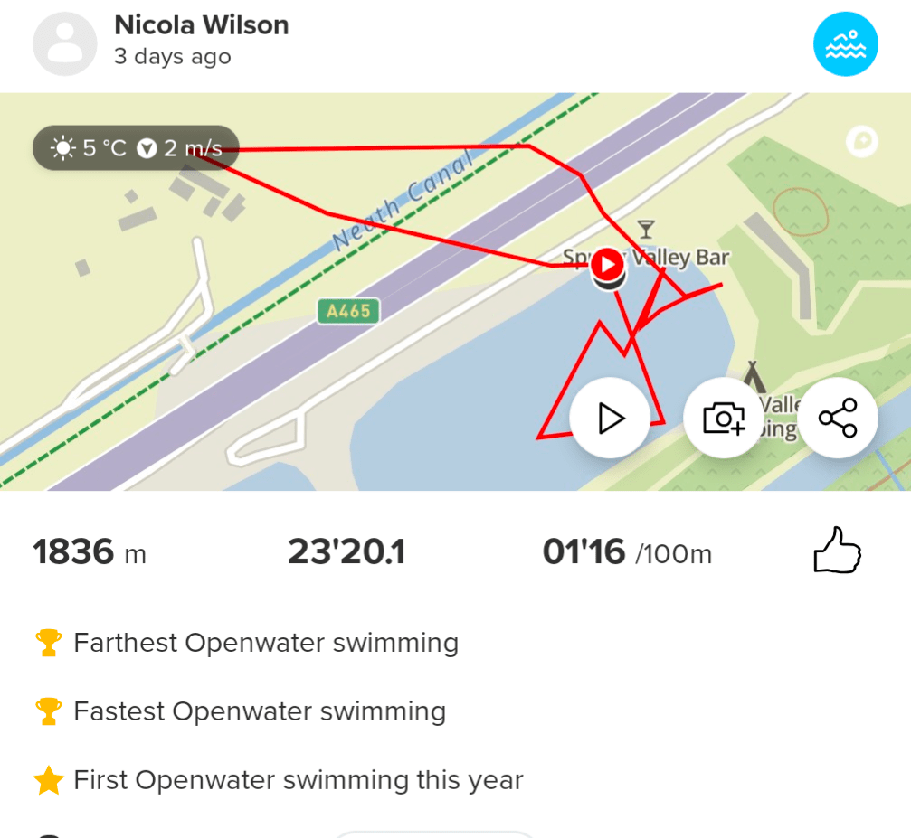 After the walk I drove over to Spring Valley Lakes in Glynneath to meet my friend Judith for a swim. Air temp 2°, water temp about 4°. It was so beautiful, the sun was shining, blue skies, but the lake was still in the shade of the mountain and the bouys were all covered in frost. It was such a lovely swim, I didn’t even notice the cold. Swam for 20 minutes. Unfortunately my GPS went AWOL so the recording isn’t accurate. The trace in the water is the correct part that we swam.
