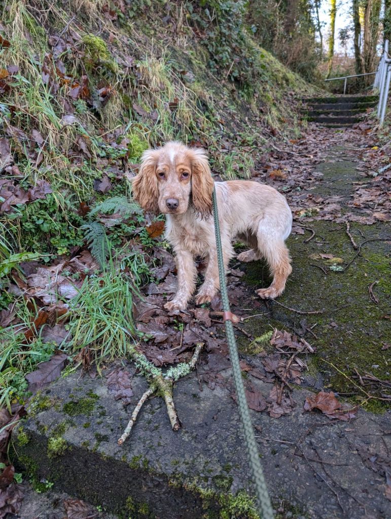 The day wasn’t done there. I had to whizz from the lake back to Rhiwfawr for a dog walk with Ralph the cocker spaniel. We walked all the way down Rhiwfawr hill which was quite terrifying due to the path being covered in ice, the hill being so steep, and Ralph pulling on the lead. I have no idea how I stayed upright and on my feet. We then walked down to the Ffynnon Well , up the steps and then back up the hill. Only 25 minutes but that hill is a workout!