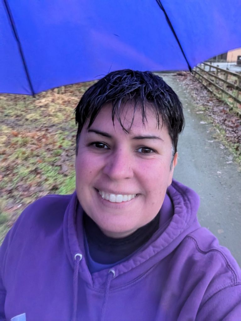 A really wet miserable day. I had to work for a couple of hours at Sunday Social and I got so wet and muddy that I really couldn’t face doing any exercise in the rain. But, I did. Actually a wet walk was more appealing than the indoor exercise bike. So I grabbed my giant golf umbrella, drove to Tesco, and walked around the cycle path that loops round the playing fields and the school. This is my favourite circular walk locally and I don’t get to do it very often. A 25 minutes walk and another day ticked off.