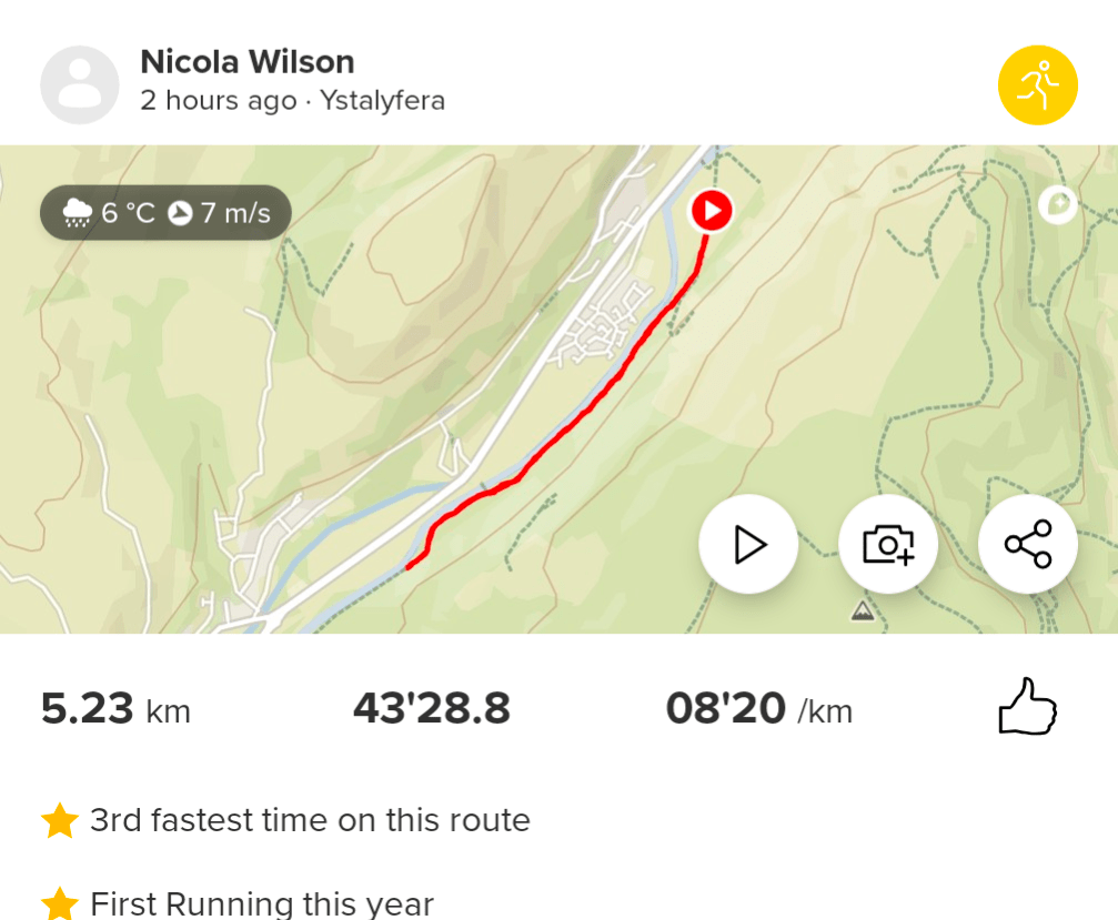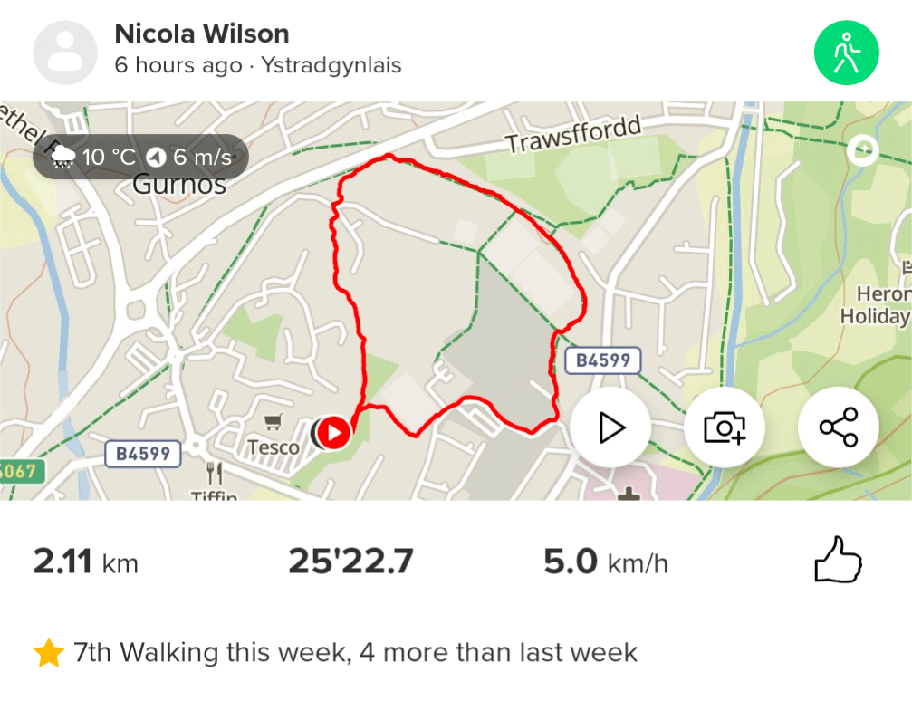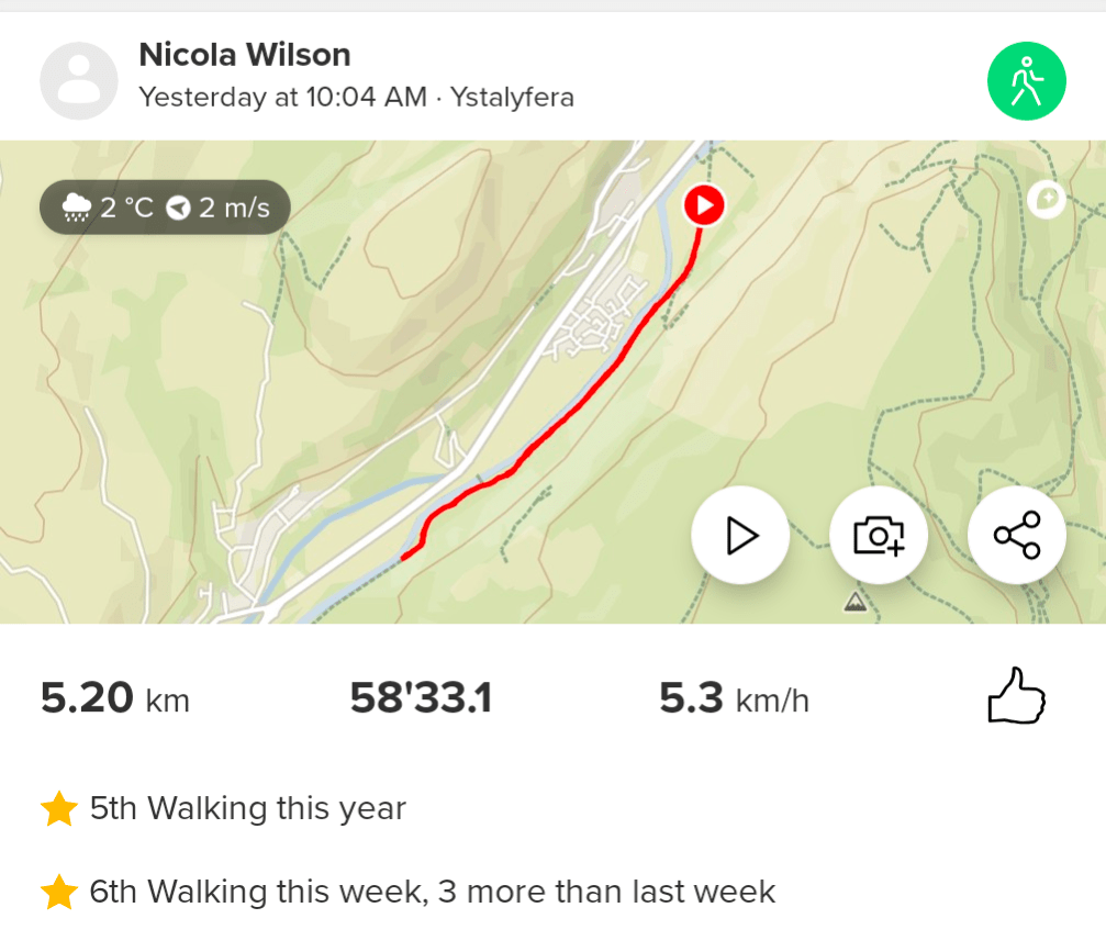 Day 1: Wednesday January 1st. I started the year off with a bang and attended the local parkrun at Cycle Route 43, Ystalyfera. I was going to walk the 5km course but as it was so wet and raining hard I opted to ‘jeff’. Jeffing is run/walk, and I used the 30:30 ratio. Running for 30 seconds then walking for 30 seconds and repeating the whole way. I haven’t done much running at all since April and I was pleased with how it went. I didn’t feel like I had lost too much of my fitness. I completed the run in 43 minutes and 36 seconds. Another goal for this year is to finally get my time below 40minutes.