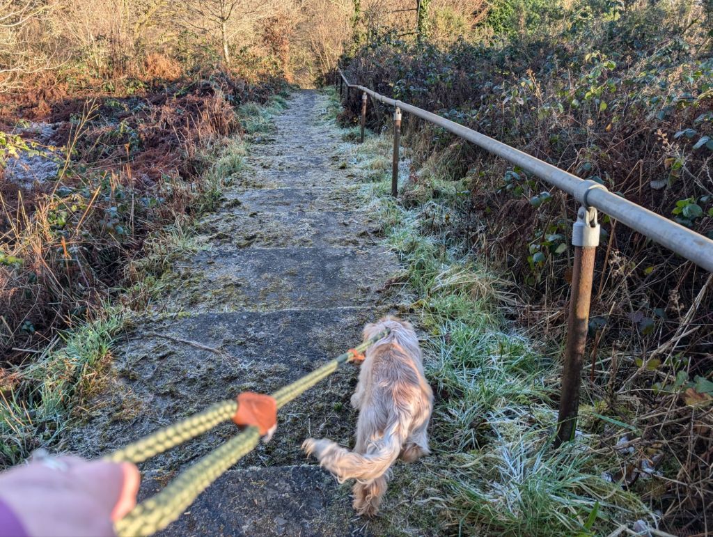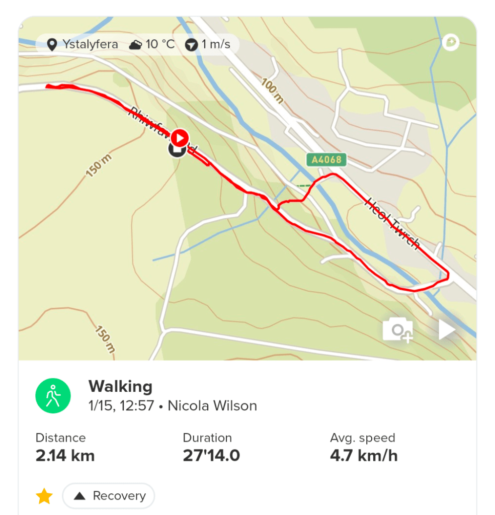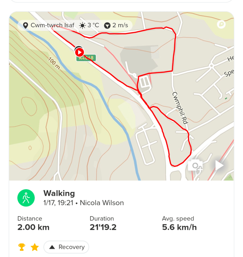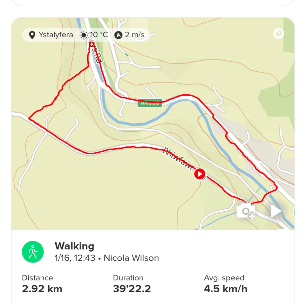Thursday January 16th – Today was another walk with Ralph. I was only getting paid for a 30 minutes walk but the weather was so sunny I decided to go a new route with him which actually took 40minutes. I just wanted to keep walking. Instead of walking down the hill with him, I decided to try going up the road, something I’ve avoided doing previously as there is no pavement. Anyway, a little way up the road and we came to a public footpath, so I turned off down there. After a short walk through some grass and trees, we came to what felt like a million steps. I was just happy to be going down them and not up 🤣. The steps eventually ended and we came out in upper Cwmtwrch where the road splits into 2 by the river. From here we walked all the way back down the main road, to the Ffynnon well and then up the few steps there, onto Rhiwfawr hill and back up. It was a really good circular walk and maybe I’ll try it in reverse one day if I’m feeling energetic 😁