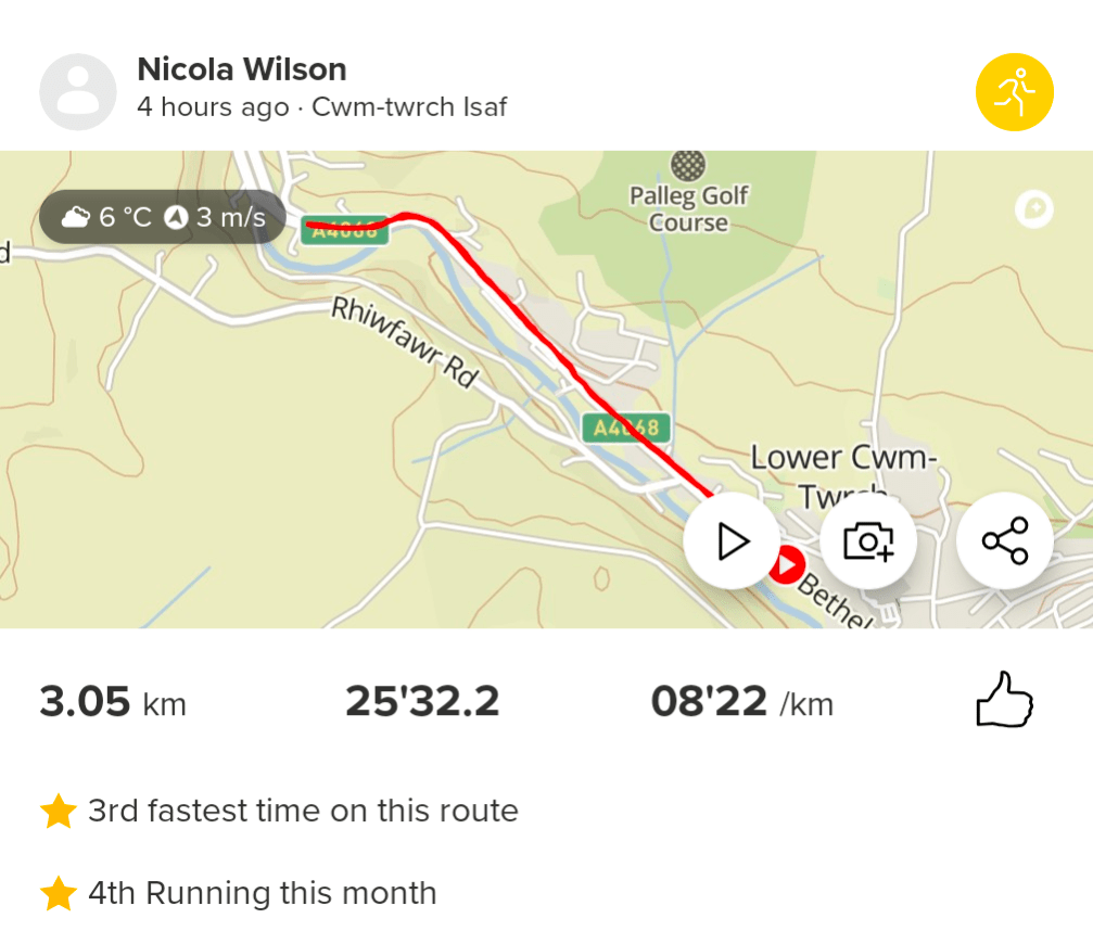 Monday January 13th – Today I had a crazy stressful day with work and house renovations, I actually couldn’t wait to go for a run to unwind! Dinner was cooking so I didn’t have long. I opted for the same run as last Monday, a straight run up Cwmtwrch and back again. Two minutes into the run all I wanted to do was stop and either walk or turn around and head home. I just kept telling myself, keep going, don’t walk. You did it last week you can do it again this week. So I pushed through and got to the turn around point. That was the worst part over as it is slightly up hill, the way back is always more enjoyable. Running for home and I was now feeling really comfortable and started to enjoy the run. My mind was working overtime and it got me thinking. The reason I’ve not managed to run a 5k in under 40 minutes is because I have never run consistently. On at least 3 occasions I have completed couch 2 5k, run a couple of parkruns and then quit. Christmas day 2023 I hit my current 5k pb of 41.14. And at that point my times had been slowly improving. However, I was training for a marathon and the distances were getting longer and longer and my times started getting slower and slower as I was just trying to hit the distance. So even though last year I ran the most I’ve ever run in my life, it still wasn’t consistent and after the marathon in April I all but stopped running. This year, I have to keep running. I am determined to improve. My run tonight was 1 minute 8 seconds faster than last week, and I ran the 3rd km in 7mins 48 seconds. If I can keep that pace up for 5kms then I will easily break that 40 minutes barrier. This is the most positive and confident I’ve ever felt about running and I am really starting to enjoy it for the first time ever. Ran for 25 minutes non stop.