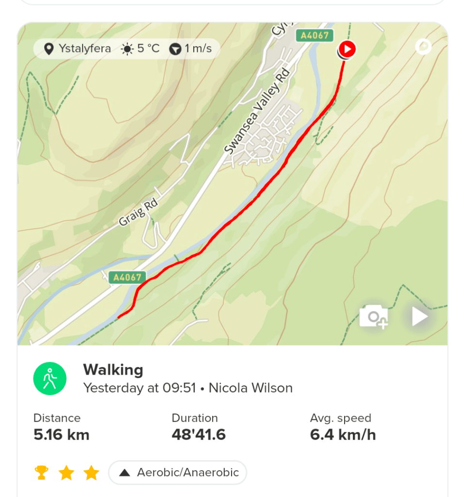Tuesday January 14th – Not a very exciting day today. Busy at work and a busy evening. Only just enough time to quickly have dinner and then I had to meet the kitchen fitter up the new house. From there I needed to go straight to play darts. I was actually running late which meant I didn’t get chance to practice. First match back since Christmas and I was a little rusty to say the least. My first 3 darts I scored zero with them all missing the board!! 🤣 I did improve slightly and my team won 9-2 (I was one of the losing two). Anyhoo, Emma needed my van for work tomorrow but as I needed it this evening she was unable to collect it earlier. So after darts I dropped the van to her house and then walked home. This was the perfect opportunity for me to get in today’s exercise. I was genuinely struggling to find the time today. I walked from Ystradgynlais to Cwmtwrch, mostly along the main road. A nice brisk walk. It was so foggy I could barely see where I was going. Made it home in 28 minutes.