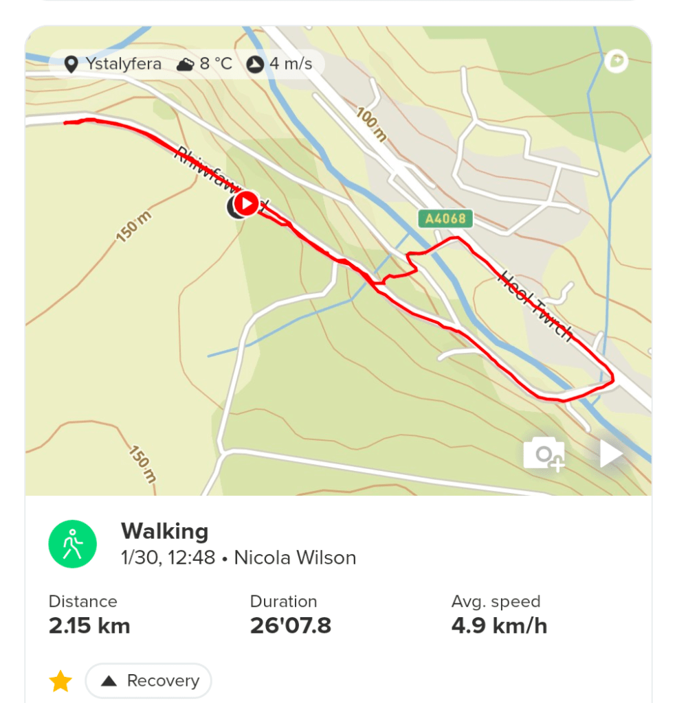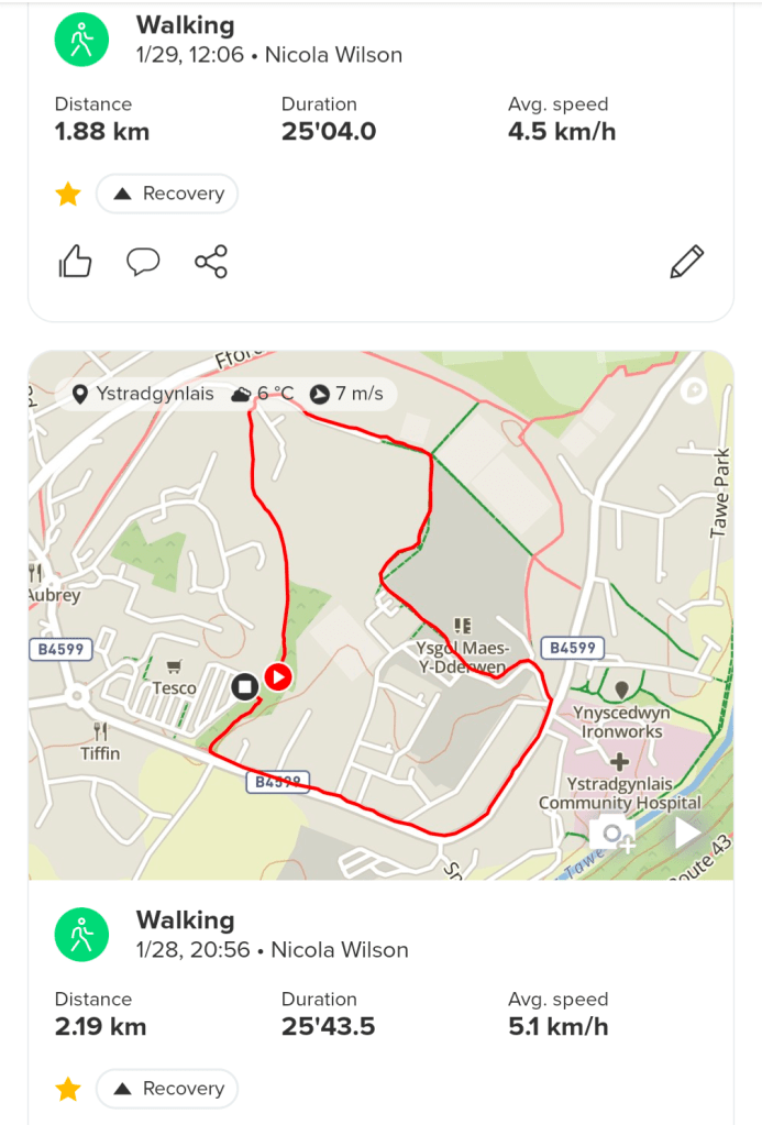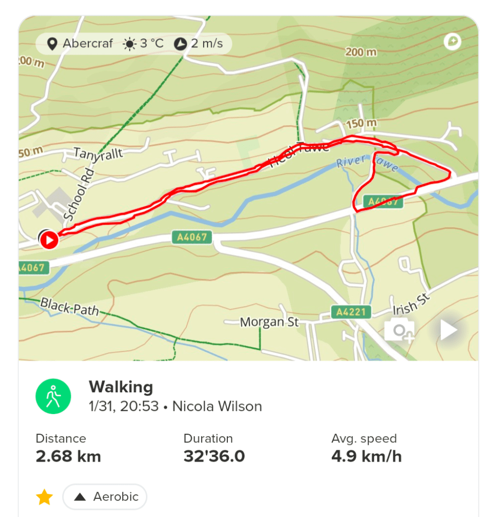 Friday January 31st – I needed to go to Abercrave tonight so decided whilst there to do my walk somewhere different for a change. I walked all the way through Abercrave from one end to the other and back again. It was a pretty cold evening so I tried walking as fast as I could to keep warm. I would say it was a nice change to walk somewhere different but it was so dark it was just like walking anywhere else in the dark. Also, I did not realise there was a hill in Abercrave! I drive along it nearly every day but when driving it feels flat 🤣