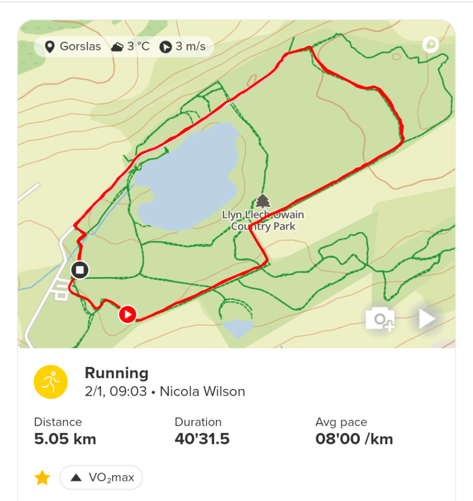 Saturday February 1st – A new month which means I have successfully completed exercising every day in January. And today is parkrun day! Encouraged by Judith, we went to try out a new parkrun (for me not her). Llyn Llech Owain Parkrun which is located in the country park just outside Cross Hands. When we arrived it was about -2° , in the shade and very icy. I didn’t know what to expect as this was a new course for me to run, all I knew was it was on trails. This gave me the perfect opportunity to try out my new trail running trainers that I bought a few months ago and hadn’t had opportunity to wear them. So we set off on the parkrun and soon into the 5kms there was a huge hill that was never ending. I actually thought I was going to die, it was so tough. I swear 90% of this course was uphill. And I had to do 2 laps!! Despite the hills and my breathing struggling, I refused to walk. Just kept on working those legs and catching my breath on the brief downhill section. To my shock surprise I finished in a time of 40:30, which is my 2nd fastest 5km run ever! And had I not got a parkrun PB last weekend, this would have been a PB (personal best). Considering all the hills I’m really really pleased with the time.