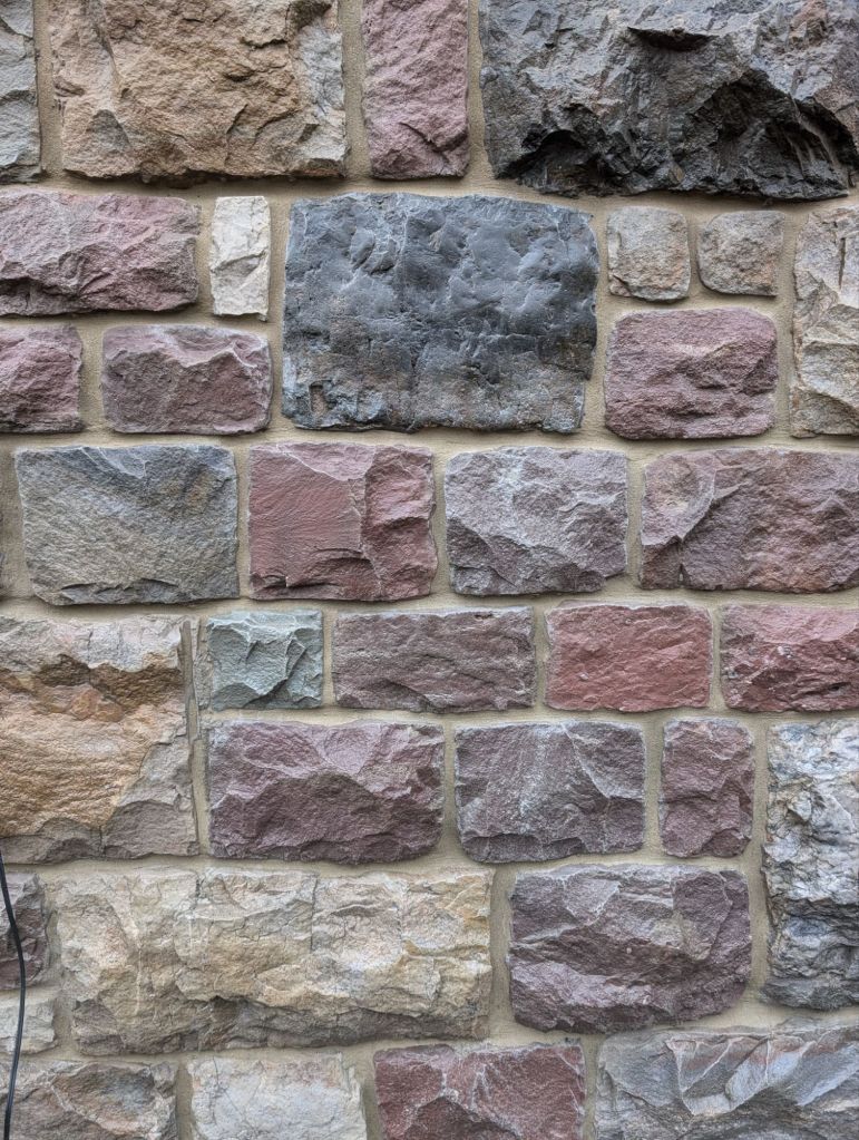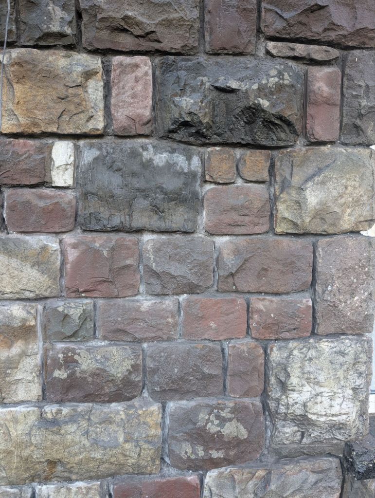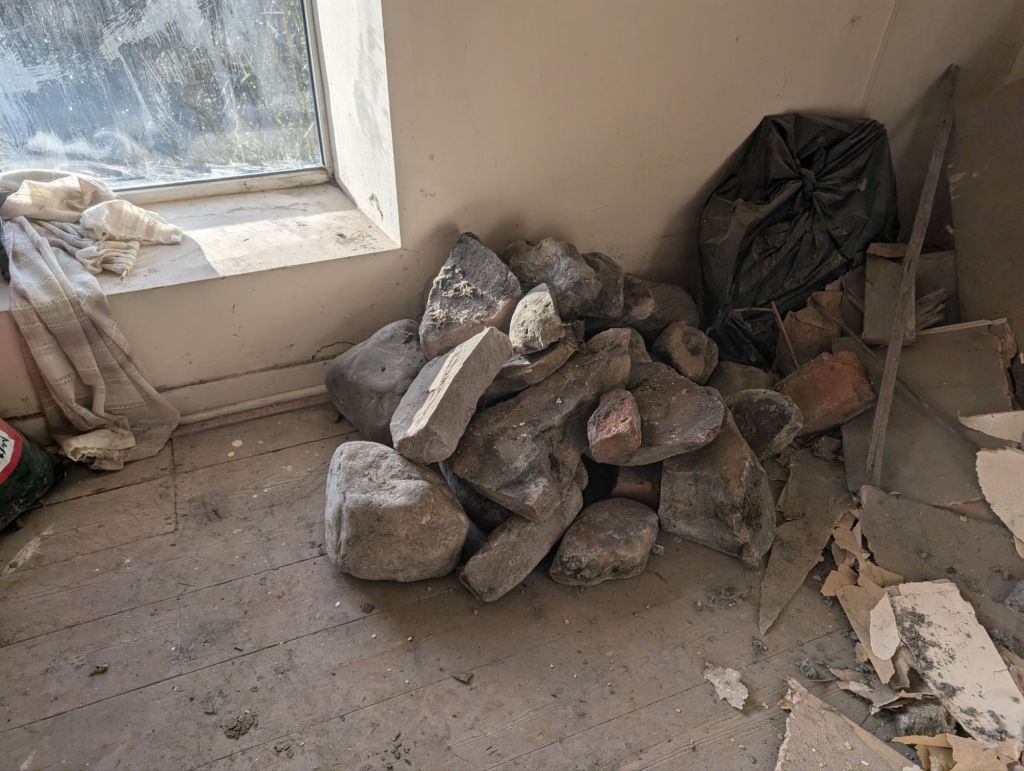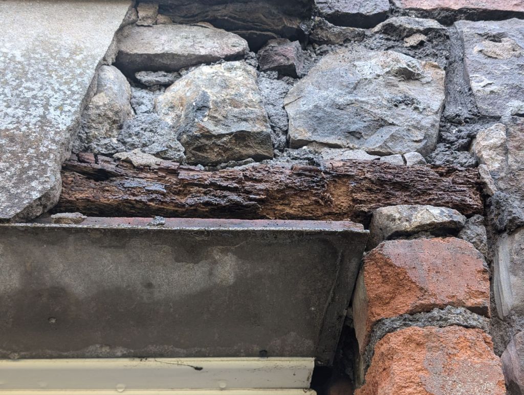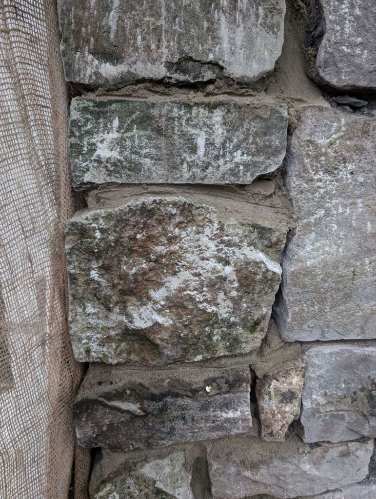 Before we could get the stone sandblasted, the lintel would need to be replaced. We also asked Liam to replace the red brick with stone. We sourced some stone from the old wall that borders our woods at Motsi’s Meadow.